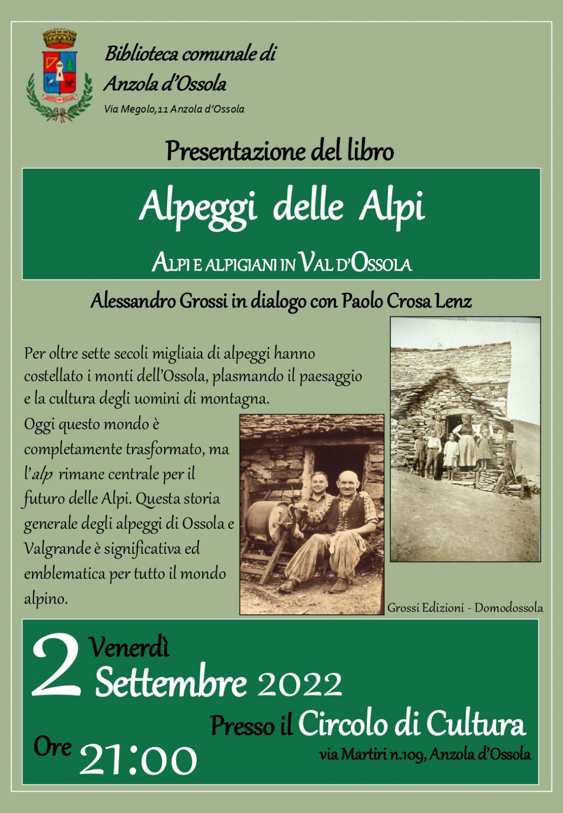 Venerdì 20 Settembre 2022 ore 21:00 presso il Circolo di Cultura si terrà la presentazione del libro ''Alpeggi delle Alpi - Alpi e alpigiani in Val d’Ossola''. Alessandro Grossi in dialogo con Paolo Crosa Lenz.
