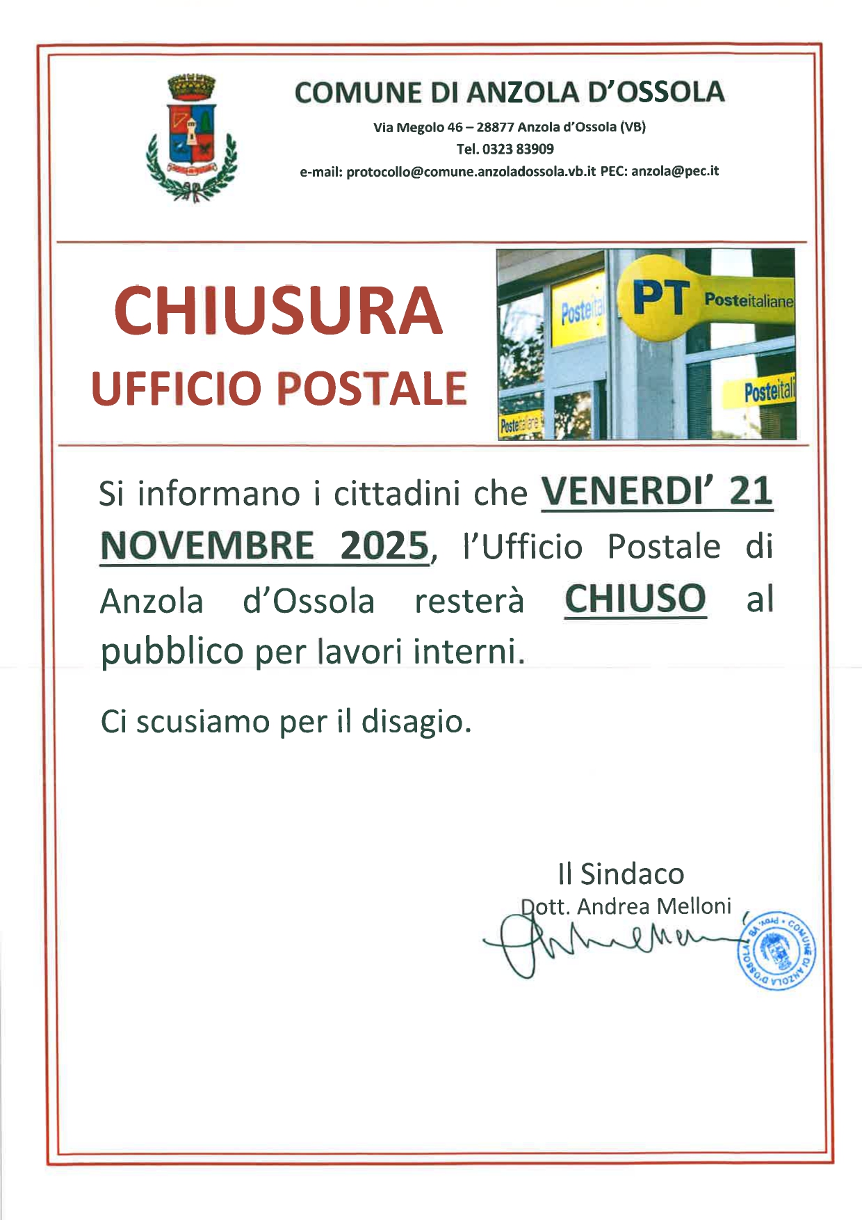 Si informano i cittadini che VENERDI’ 21 NOVEMBRE 2025, l’Ufficio Postale di Anzola d’Ossola resterà CHIUSO al pubblico per lavori interni.