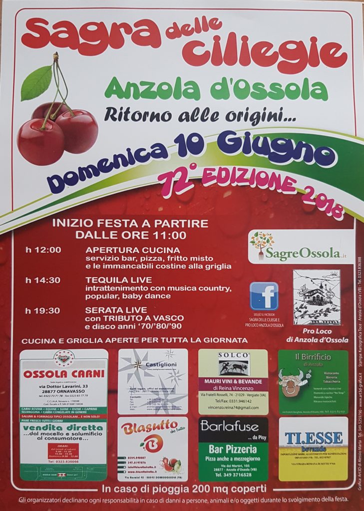 Nel corso degli anni questa manifestazione è cresciuta varcando i confini dell’Ossola, grazie soprattutto all’impegno della pro loco che cerca di offrire il meglio e di accontentare i più svariati palati, con una cucina ormai nota specialmente per le costine alla griglia, il fritto misto e le crostate nostrane di ciliegie.